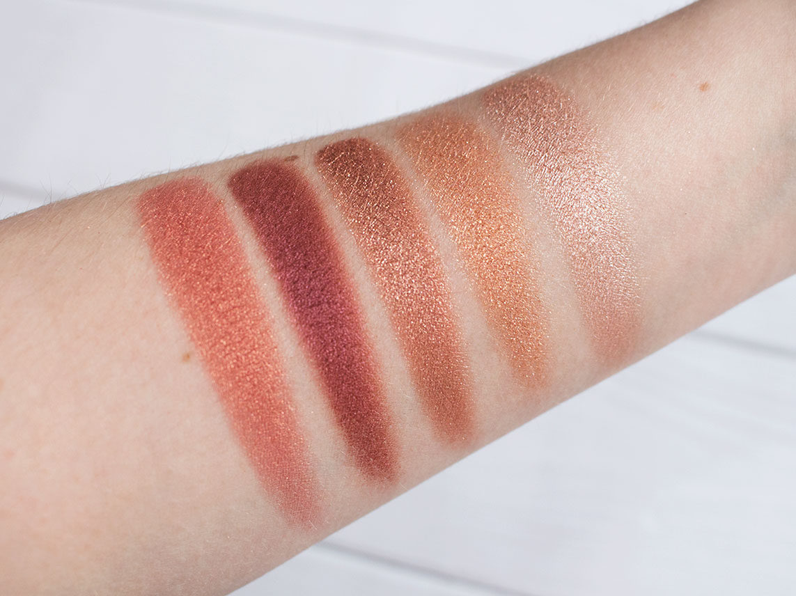 Makeup Geek Grandstand (Foiled): A metallic copper with a rose gold undertone and lots of glitter. Suuuuuuuuper pigmented shade, another one that the swatch doesnβt do justice for. Canβt wait to do a look with this, itβs so so beautiful. Itβs my favourite shade overall I think!