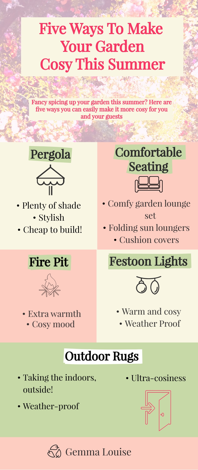 Thereβs nothing better in the summer months than sitting in your own back garden cosy with a bottle of cider or a glass of wine, enjoying the lighter evenings and the warm sunshine. As we spend more time outdoors in the evenings over the next few months, itβs nice to make our gardens a cosy space thatβs comfortable to sit out in with lots of pretty lighting, not only is it much more enjoyable for ourselves, but it creates a lovely ambience for any guests we invite over too! Here Iβm sharing five ways in which you can update your garden and make it into a snug, warm space.